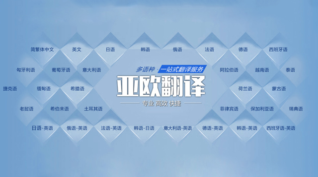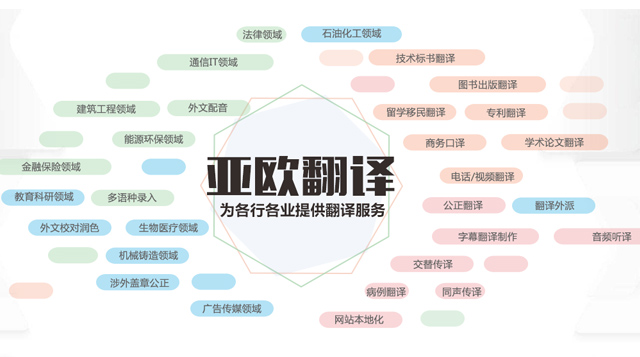 亚欧翻译集技术翻译、口译、软件和网站本地化、多媒体视听翻译、中外文录入排版等一系列语言服务为一体,公司承担着出入境管理局、政府机关、公检法相关涉外部门、以及电台、电视台等同级机关的有关涉外翻译事项,同时与国内几百家企事业单位和国外众多知名企业有着持续稳定的业务关系,帮助海外客户使其产品和服务进入庞大的中国市场并协助国内客户成功拓展国际市场。